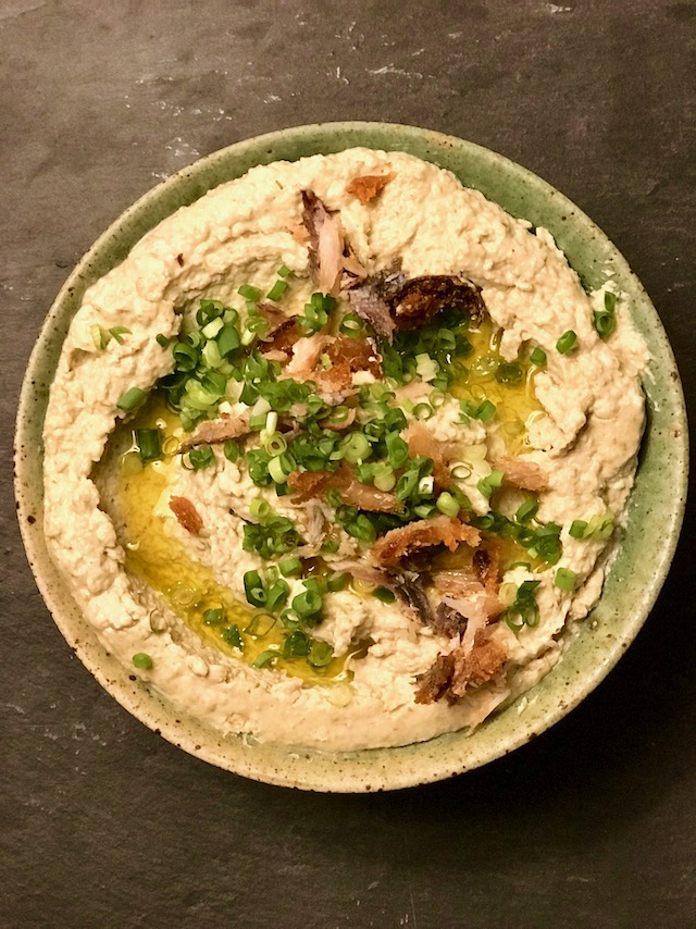 This is an interesting take on hummus and I will try it out–thinking about choices for the fish…perhaps kippers will work?