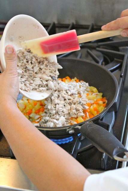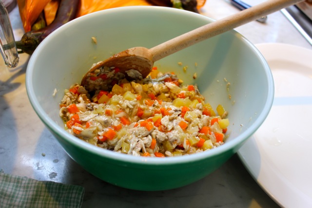 M’s recipe is quite traditional, and she sautes onions, potatoes and carrots then adds the steamed, deboned and flaked bangus meat and mixed this up gently. Season with salt and pepper, and set aside to cool. Because this was an unplanned exercise, we had several ingredients missing, including some raisins, that I gather are meant to bring sweetness and a bit of moisture. I always think of plump cooked raisins as garapatas or engorged ticks, but let’s not go down that path now… :) Some folks add ground pork, others more herbs, etc. But you get the picture, deboned and flaked meat, a bit of extender and starch in the potatoes, sweetness from the onions and color from the carrots. And enough volume to stuff back into the fish skin.