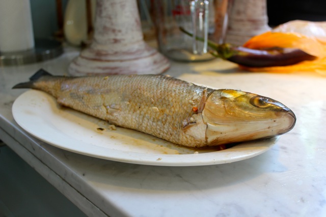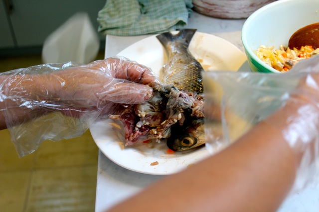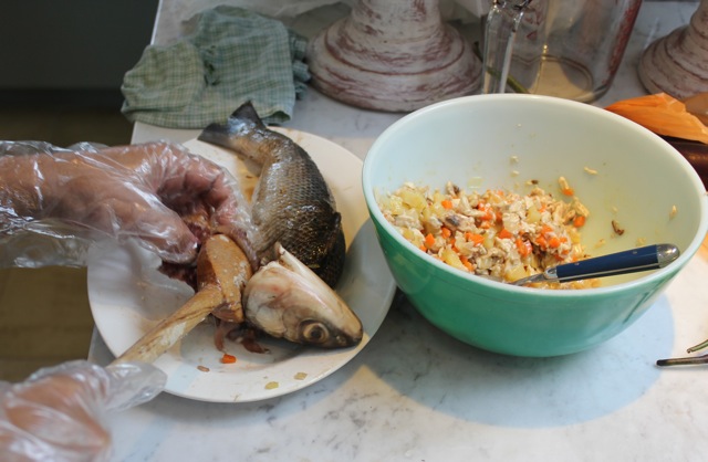 M used a long wooden spoon to get the filling all the way down into the fish skin.