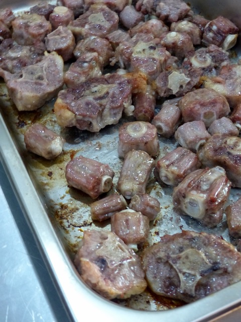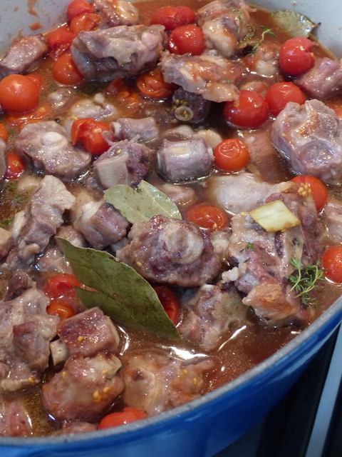 Add two tins of chopped or whole tomatoes, two tins of (or homemade if you have it) of beef broth, a tin of water to just about cover the oxtails and other goodies. Cover this, bring to a boil and then place in a 320F oven for some 4+ hours until the meat is so tender it’s just easy to take it off the bone.