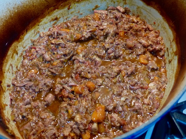 Discard all the bones and return everything to the pot and adjust your seasoning. At this point, it looked like I had too much meat and too little sauce, so you may want to opt to add three tins of tomatoes instead (I am a saucy type). If you like some heat, you can add some dried chili flakes and bring this back to simmering temperature.