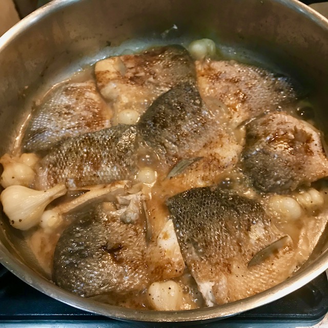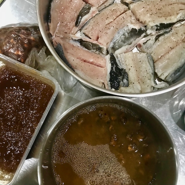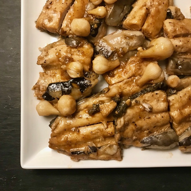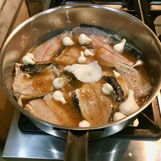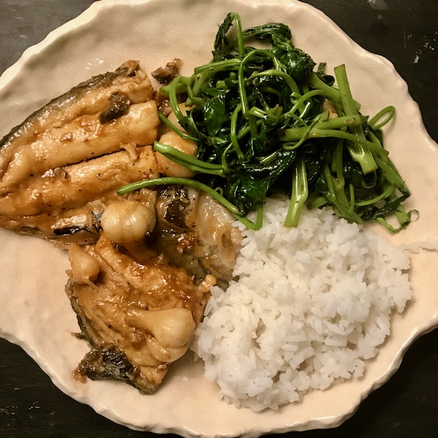 Halfway through cooking, I was worried that the flavor might not permeate all the fish, so I carefully flipped them over. In retrospect, you might start off this way and flip them the other way around so the skin crisps up a bit in the minimal fat in the pan when you are nearly done cooking. Add some soy sauce and season with salt to get the right level of saltiness to your liking nearing the end of cooking. I pulled this off the heat just as most of the liquid had evaporated. Think of this as a variation on paksiw, or acid braised fish, so essential in the times with no refrigeration and it could sit out for hours without spoiling.