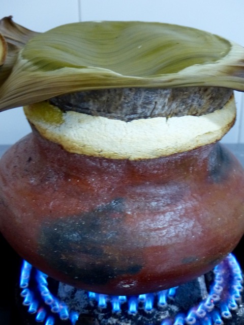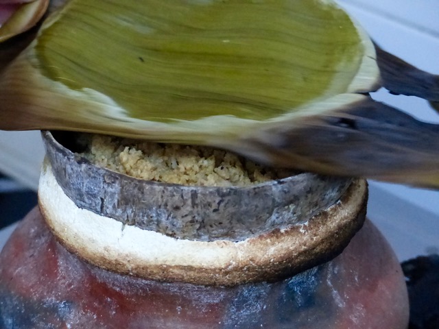…cover with more cassava mixture and cover with banana leaves and top with something heavy like a pot lid and let this steam for a few more minutes.