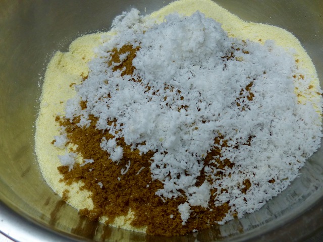 To the cassava flour add brown sugar (a nice deep dark brown sugar or muscovado that has been sifted) and some freshly grated coconut, not quite at its driest stage and not wet either.