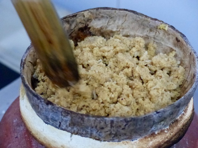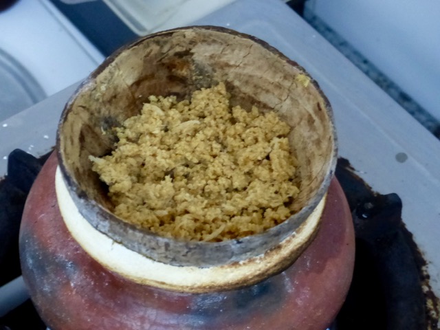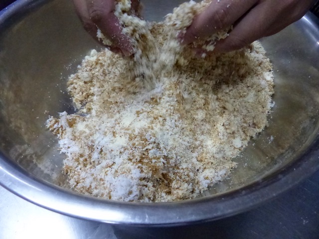 Mix this by hand until you get a crumbly slightly damp consistency. I wanted to add some coconut or cow’s milk at this stage, but was told that was a modern twist and we should do it the traditional way first. :)