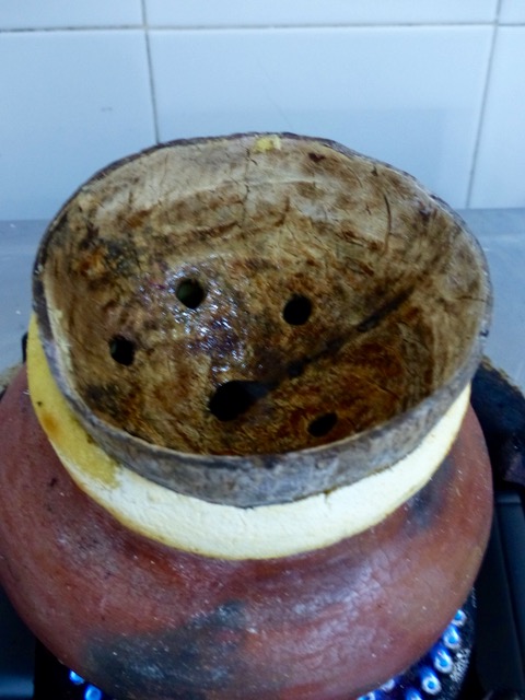 Now starts the interesting part. Place a small palayok over a gas burner (or charcoal of course if you like) then place a “bao” or coconut shell with large holes cut into the bottom and seal in the steam so that a sort of pressurized steam pushed up through the ingredients to steam a cake. I think this was a simple dough that was used to encircle the bao and create a seal.