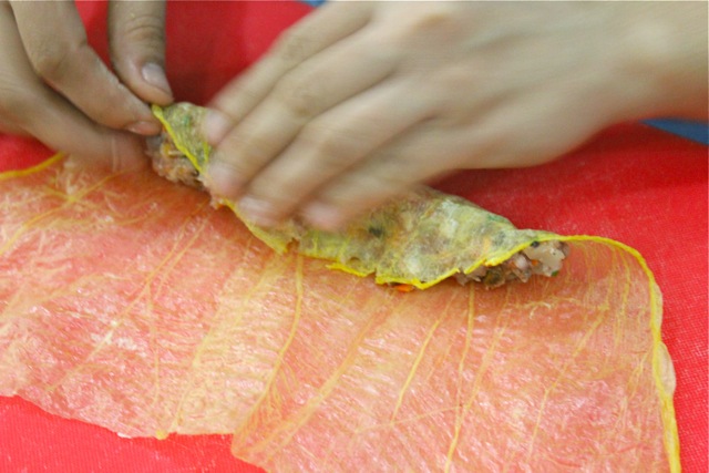 Place approximately 90-100 grams worth of the filling on the curved end (or one end) of the soybean wrapper (tau’pe) and roll it up as you would a lumpia or spring roll. You should end up with roughly 16 rolls.