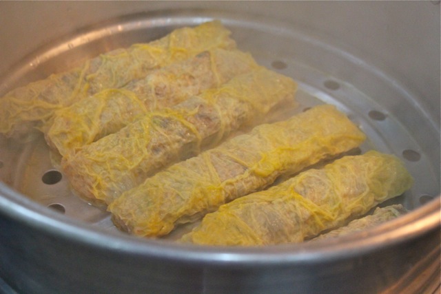 Now for a controversial step. Most folks are in a hurry, and almost everyone on-line says just go ahead and fry these up in some nice oil. STOP RIGHT THERE. I think an essential step is to steam the rolls first. It ensures that the flavors meld well, that the meat is cooked through, and that the wrapper is moistened. That is important to the texture of the final product, in my opinion.