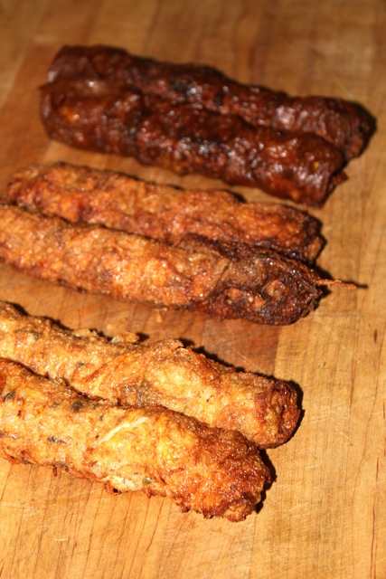 Just to show you the difference between straight frying and steam then frying, take a good look at the two kikiam at the back of the photo above… yup, you got it, fried straight away, without the steaming step. The skins get a very dark brown by the time the meat is properly cooked. If you had a thicker roll the problem would be exacerbated. And the flavors of the stuffed meat are a little less appealing. The four kikiam in the front of the photo were steamed first. Oh, and we fried in lard. Extra flavor step. :)
