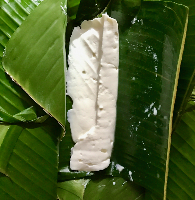 Somehow, the promise of what lies within is almost always overestimated when it comes to quesong puti wrapped in fresh banana leaves. It seems as though the more layers of banana leaves that enrobe the simple, soft, briny white cheese made from carabao’s milk, the more likely you are to get a puny portion of the native delicacy. Gone are the days when 500 gram squares of cheese could be had for a reasonable sum. Knowing all this, I bought three parcels at the market today, for PHP40 each.