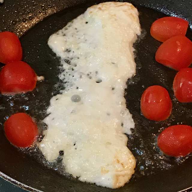 Back at home, for breakfast, I fried up one portion of cheese and added some halved grape or cherry tomatoes to the pan and watched it sizzle. I could immediately hear my mom’s voice somewhere out there saying “you have to fry it to kill the cooties…” which just seems a bit ridiculous, doesn’t it? But then again, we have ALWAYS fried it, despite the fact that I have tasted it “unfried,” soft and unctuously simple (an oxymoron) and I never gotten sick or died of hepatitis.