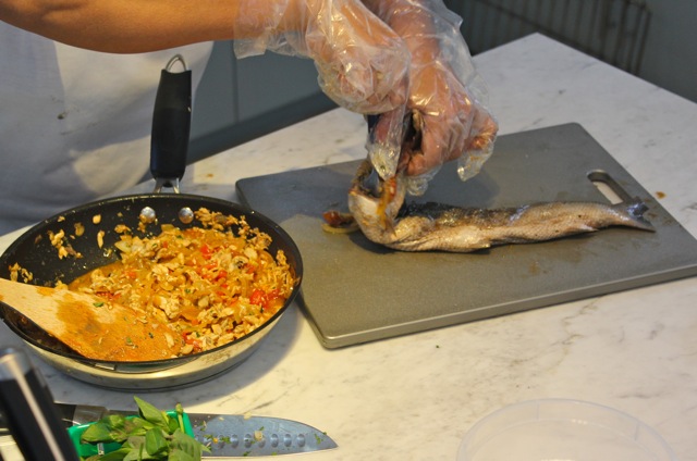 Stuff your bangus skin; note the excess liquid in the pan. Too much liquid. Pain in the next step.