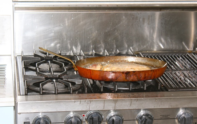 You should get a “splatter screen” to cover your frying pans (although an oval one to match the copper pan might need to be custom made). It’s a cheap and efficient way of saving all and sundry (especially curious roving pets) from the danger of burns from violently sizzling oil. One particularly large canine in our household refrained from ever entering the kitchen whenever something was sizzling ever since, as a puppy, he got splattered on his curious nose.