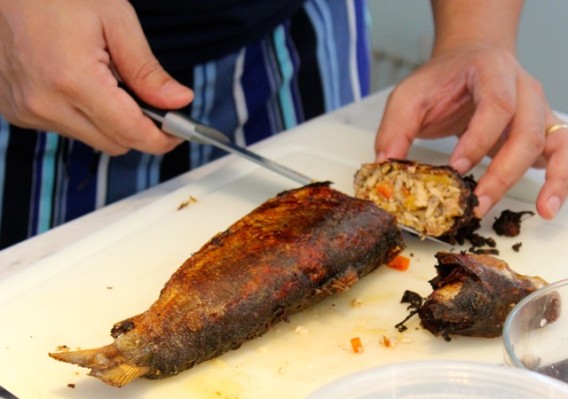 Before frying the relleno, we insert a BBQ stick in the mouth of the bangus all the way up to near its tail. Cut the excess stick before putting into the hot oil. Turning the fish will not too difficult.