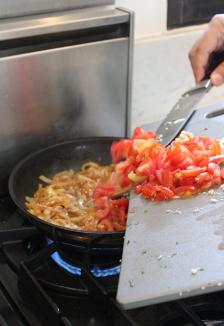 I thought about the dish a bit more, and saw that we had some wonderful ripe native tomatoes and chopped some of those up and added them to the pan. Again, too much in proportion to the size of the fish, so I would reduce volume a bit if you try this at home.