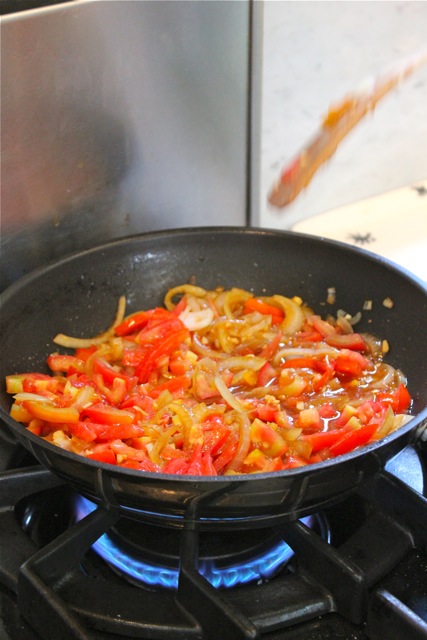 Saute lots of onions (a bit too much in proportion to the fish in this experiment) and some minced garlic in vegetable oil, or if you have it, some good lard.