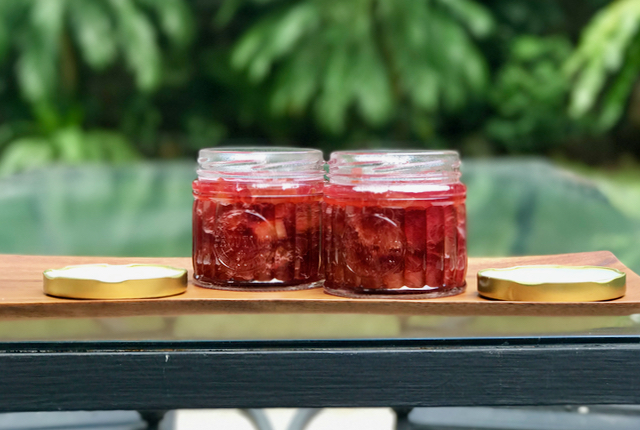 My suki, Mary, at the FTI market, knows I go weak at the knees when she stocks rhubarb, and she just smiled today when I spied a large crate filled with rhubarb, and at only PHP150 a kilo, a fraction of the price at the other snazzy weekend markets or groceries. So I bought some 2-3 kilos as well several punnets of strawberries. I will almost inevitably make these strawberry rhubarb pies I have featured before that are an absolute house favorite, and I still had more than a kilo to work with otherwise.