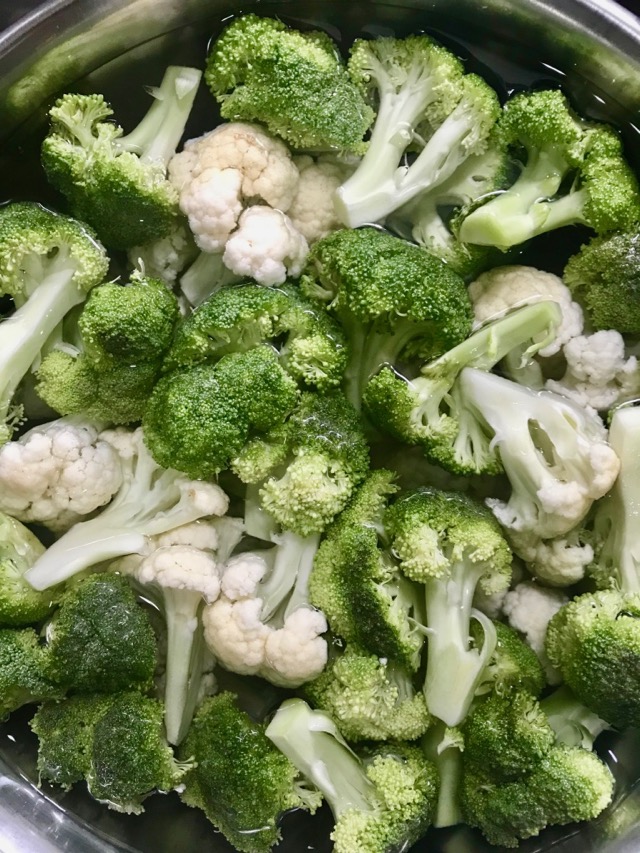 Cut cauliflower and broccoli into medium sized florets. Wash or soak well and drain and spin dry.