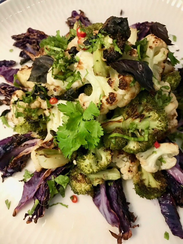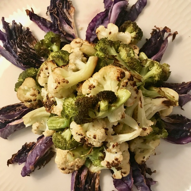 Slice red cabbage so that the central stem holds the leaves together. Heat up your oven to 400F. Into an ovenproof pan, heated on top of a burner, add some vegetable oil (grapeseed, canola, etc.) and add the brassicas and let them be. Once they start to brown slightly, place them into the oven and let them roast on high heat. After about 10-12 minutes, check on the veggies and turn them over for even browning. Cook for a total of 23-25 minutes (cabbage less) until well caramelized and colored.