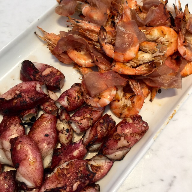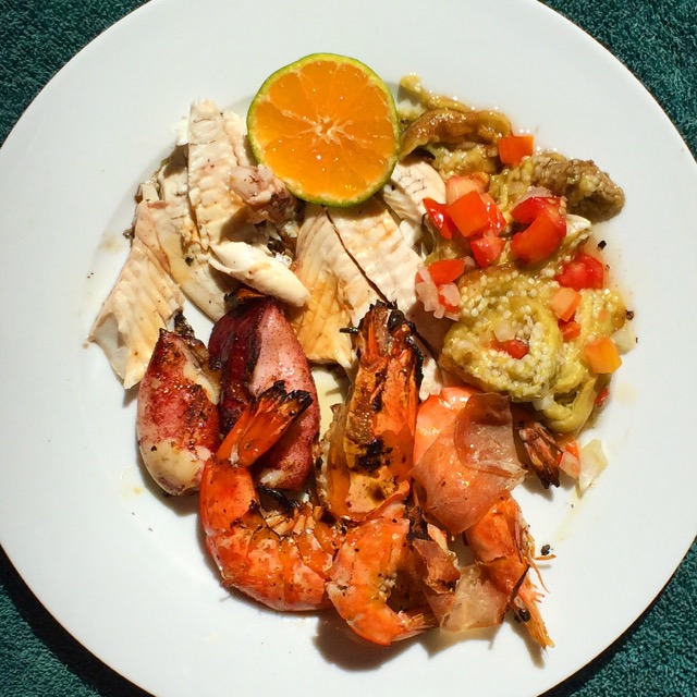 Marinate seafood briefly in soy, kalamansi, dalandan, olive oil, lemon, salt and pepper, whatever you like and throw it all on the grill. Here some baby squid cooked just right (not overcooked), some shrimp with leftover Iloilo made prosciutto wrapped around it (it was delicious, but you can leave out the meat if you desire)…