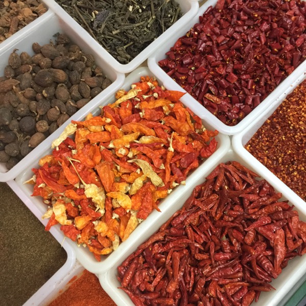 Square islands with display counters all around them were rented out to vendors who stayed inside the square. Up top, a wonderful selection of chilies and spices…
