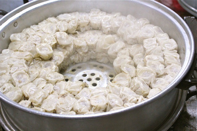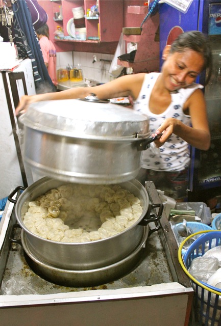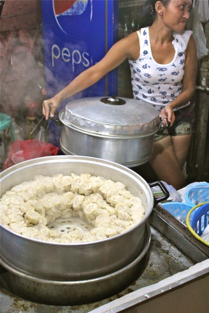 The siomais are cooked in ginormous batches in double-decker aluminum steamers.