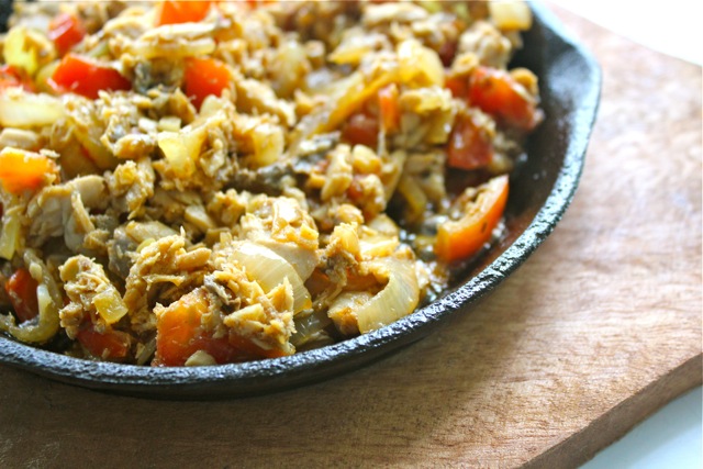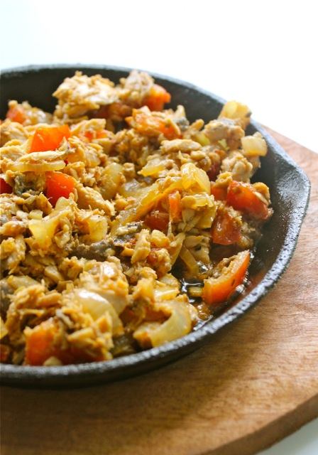 Love at first bite. If you are like me, and love the flavor combination of soy sauce and kalamansi or kikkoman and lemon (a U.S. college era thing), onions and tomatoes sauteed in some lard and flaked boneless bangus, then you might consider trying this dish. The ingredients are slightly crisped on the one side, soft elsewhere, similar to what others might call bangus sisig perhaps. An offshoot from an earlier experiment with rellenong bangus, here, I decided to try this on a sizzling plate, and the results were, for me, absolutely delicious!