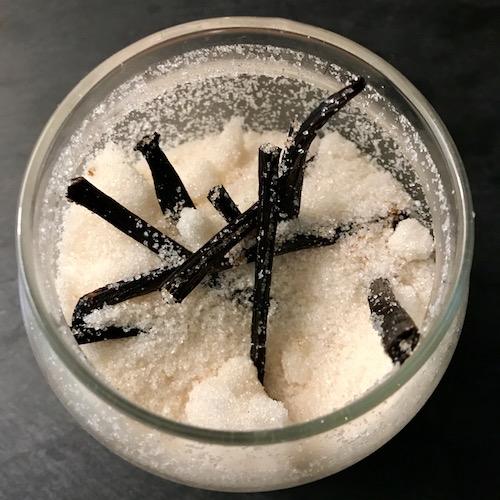 We ALWAYS have a jar of vanilla sugar in the kitchen. Used vanilla pods are simply buried in white sugar, and we keep adding pods and topping off sugar. It’s amazing how fragrant and flavorful the sugar becomes.