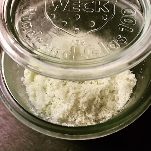 Things I might have in the fridge or larder… above, an experimental kaffir or makrut lime sugar that turned out BRILLIANTLY. Take some beautiful makrut limes (in this case, a neighbor’s gift) and zest them into some white sugar. I stored this in the fridge thinking it might keep it fresher. It is SO FRAGRANT and just that beautiful hint of flavor in whatever you put it in… sugar cookies, pie crusts, etc.