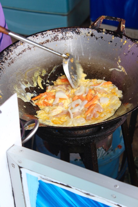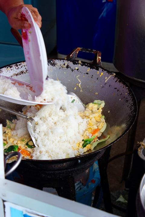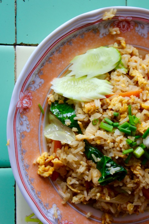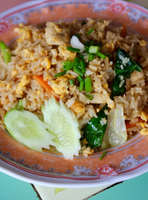 “Takaw mata” is a great Filipino phrase. I’m not sure what the english equivalent would be. “Visually triggered over-ordering”? At any rate, at the same roadside eatery we stopped at outside Bangkok where we had three plates of pad thai in this previous post, we also ordered three plates of fried rice. Yes, we were hungry.