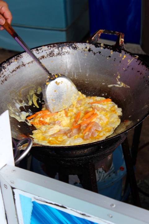 Into a wok with oil go the eggs, then chicken and sliced carrots…