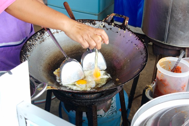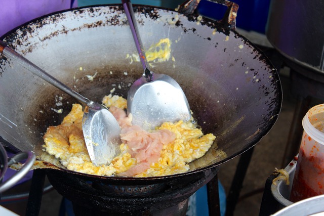 Into a wok with oil, the proprietor cracked three eggs and swirled them around roughly. She wanted the eggs lightly scrambled, but not uniformly mixed.
