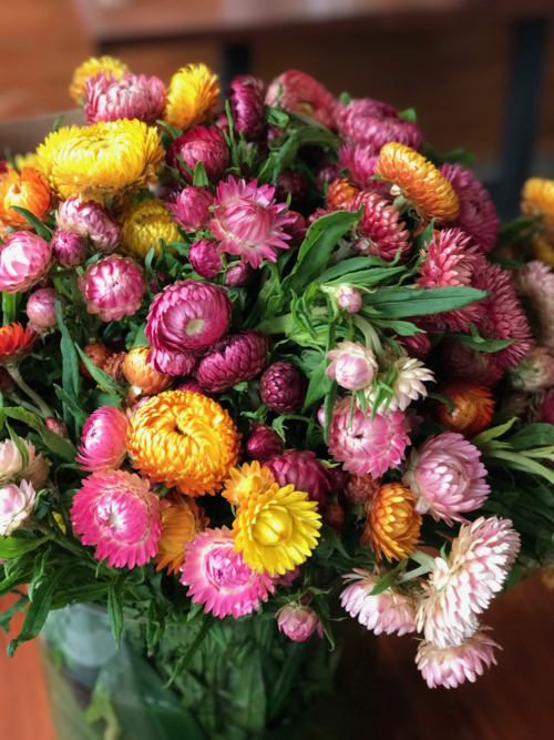 A surprise for me was the use of everlasting flowers en masse in a large vase… they are so stiff and woody up close, but so voluptuous in a large massing. Beautiful. I would use them more if there were a steady supply of them. And they dry nicely.