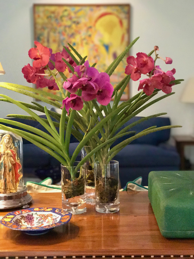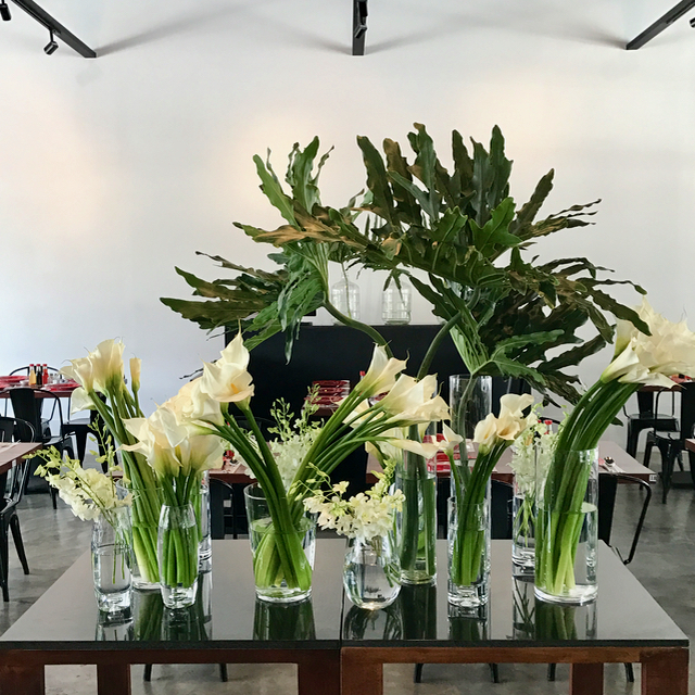 I toyed with using several dozen vanda orchids but worried about vases tipping over.