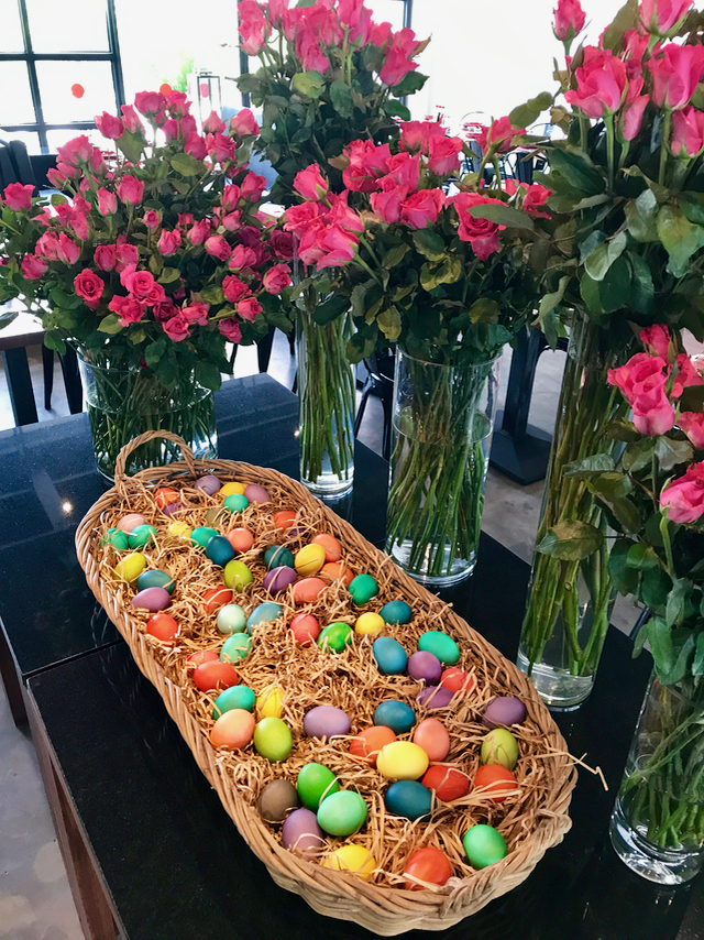 Sunday saw a basket of over 90 colored easter eggs added to the floral table, and by the end of the day, kids and adults alike had emptied the basket of most of its contents.