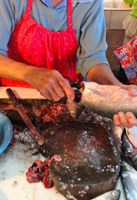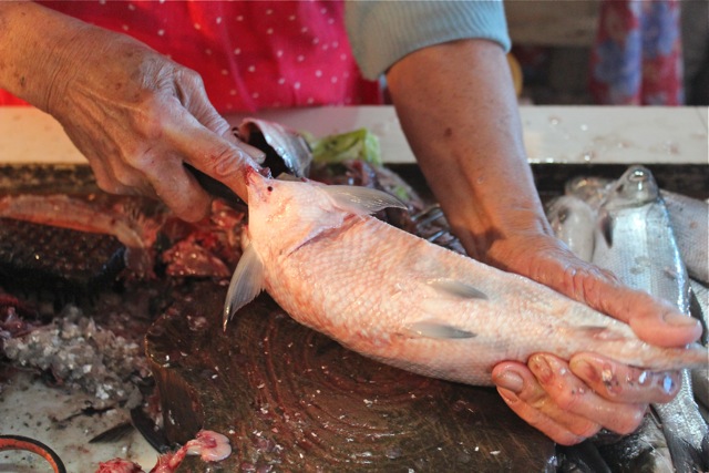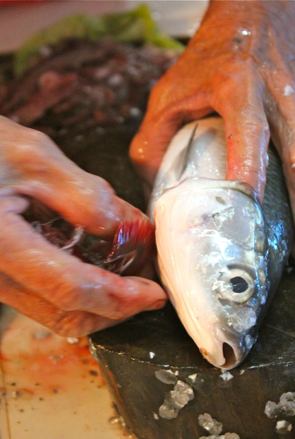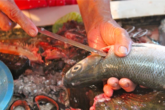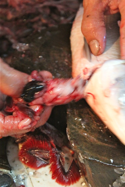 With kitchen shears, Puring cut in the fish equivalent of what I can only describe as the jugular. That’s technically inaccurate, but I am hoping you get the picture, literally. :)