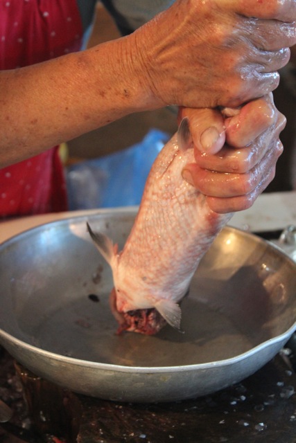 This is a continuation of this earlier post (Part I). Once Manang Puring ascertained that most of the flesh was separated from the skin, she firmly gripped the tail and bent it to break the tail bone.