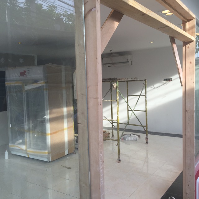 8. Visit site at T-24 hours, and marvel that there appears no sign of a front door other than a makeshift frame! But calmly confirm with poor harried assistant that all is on target for opening in a day’s time (already delayed a day from original plans, we don’t have much room for errors)…