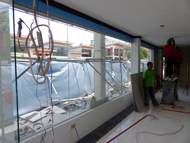 7. Glass in stalled, painting in progress, and electrical being tweaked. The building already had electricity and water and floor tiles that we re-used.